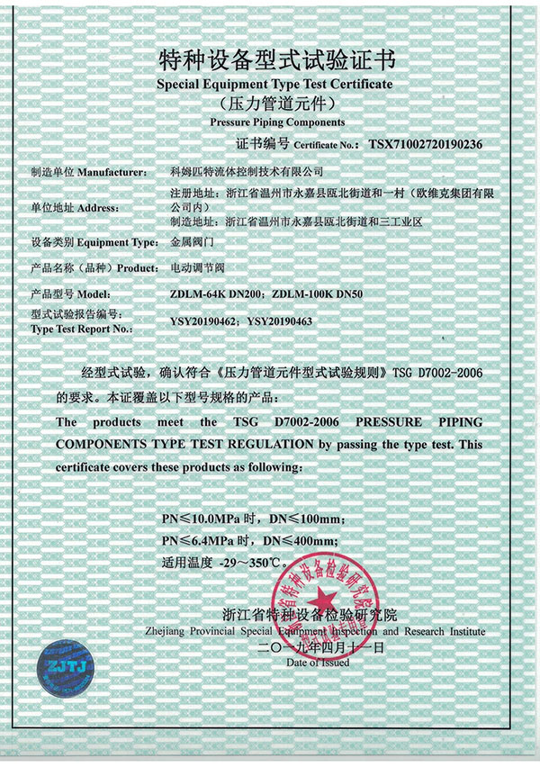 特种装备型式试验证书(电动调...