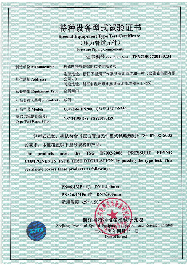 特种装备型式试验证书(球阀)